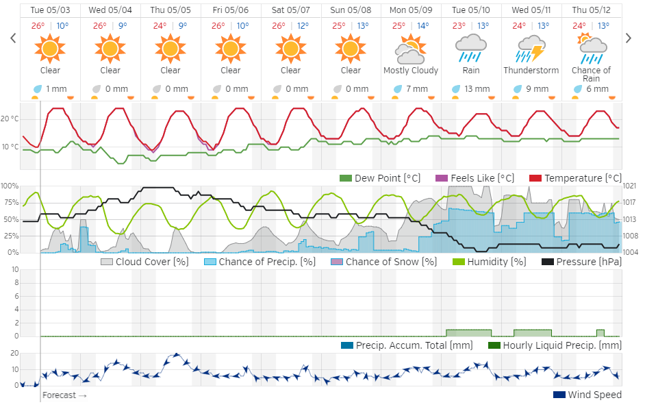 Ci siamo lamentati e giustamente, della estrema siccità del mese di aprile e a quanto pare maggio, promette di compensare almeno in parte quel periodo in cui la primavera sembrava avere troppa fretta, vestendo i panni di un'estate ancora acerba. Infatti anche dal punto di vista termico, i valori dopo gli eccessi del mese passato, paiono profilarsi entro le medie del periodo ed in alcuni giorni, specialmente dopo i fenomeni temporaleschi, localmente al di sotto.