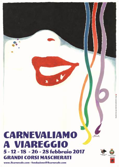 Una maschera nera sugli occhi, una manciata di coriandoli che diventano quasi lentiggini, delle strisce filanti che paiono riccioli, due grandi e sensuali labbra che recitano: “Carnevaliamo a Viareggio”. Ecco il manifesto del Carnevale di Viareggio 2017, firmato dall’artista Giorgio Michetti, 104 anni a dicembre, che promuoverà i prossimi Grandi Corsi Mascherati in programma le domeniche 5 e 12, sabato 18, domenica 26 e martedì grasso 28 febbraio.