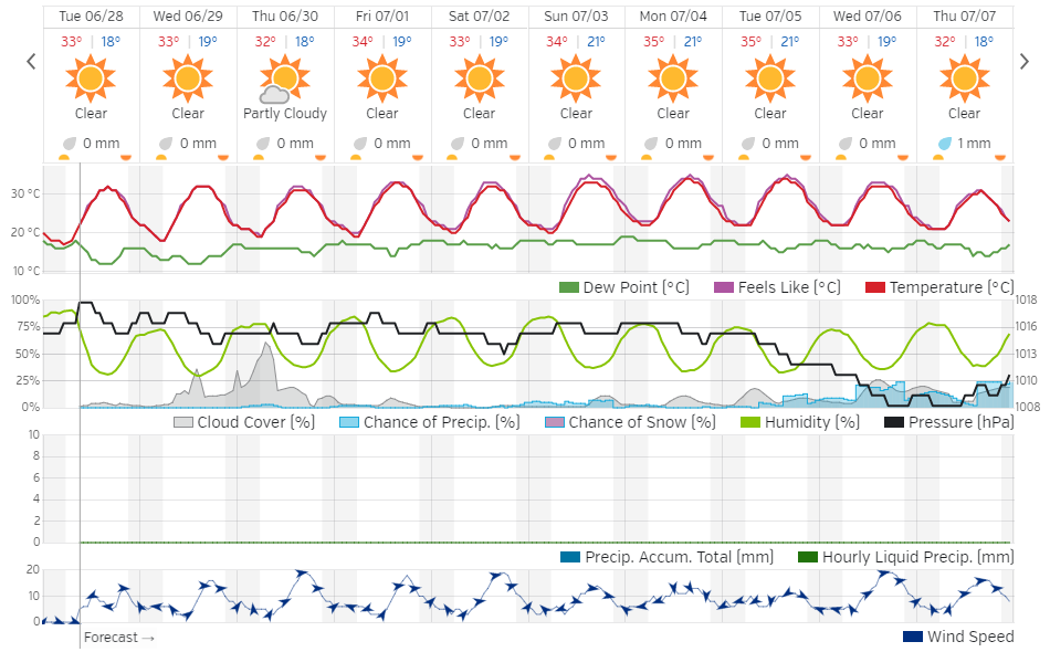 Un contesto che vedrà nei primi giorni di luglio un'ulteriore consolidamento del campo anticiclonico, obbligando attorno al 3-4 luglio, il flusso zonale a scorrere in modo parallelo al confine anticiclonico, garantendo così una maggiore stabilità anche in Toscana, dove le temperature supereranno i 33-34 C° nelle zone interne aumentando di circa 2-3 C° rispetto ai valori di questi ultimi giorni.