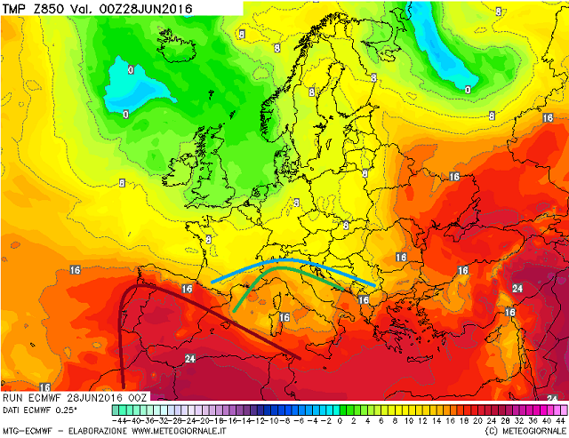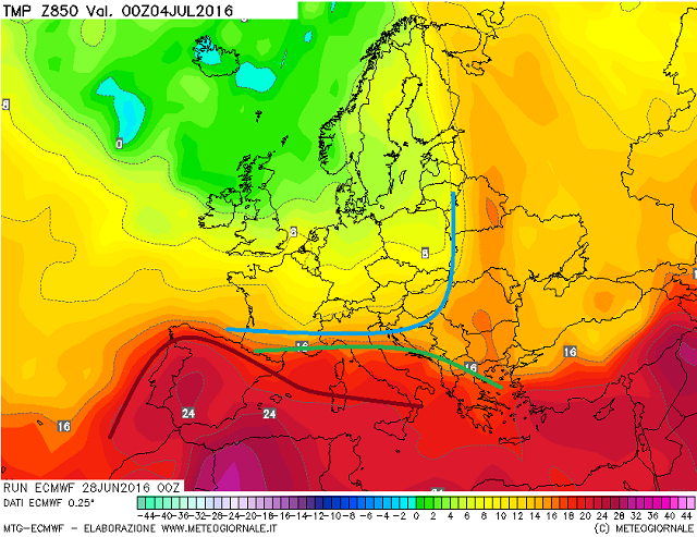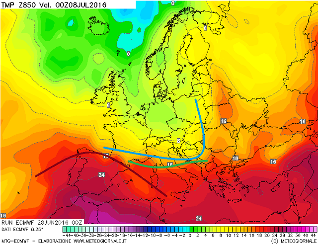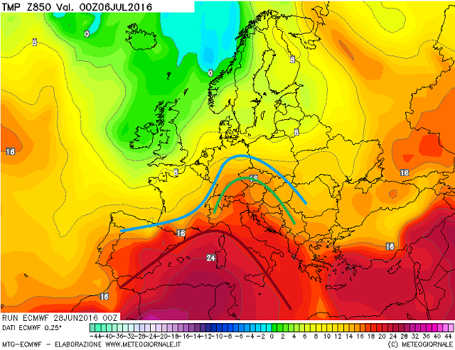E' quindi inutile postare mappe bariche molto simili fra loro, quindi oggi andiamo ad optare per delle emissioni a medio termine, basate sulle temperature in quota a 850 hpa, una vera cartina di tornasole per capire se al suolo, ci ritroveremo con valori nelle medie del periodo, e se in alcuni casi le avvezioni più calde provenienti dal Nord-Africa, tenderanno a far salire i termometri con le conseguenze che ben conosciamo, vista la veloce ondata di calore, che ci è venuta incontro nella seconda parte della settimana scorsa.