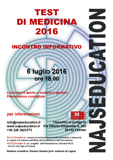Modalità del test, funzionamento della graduatoria nazionale, istruzioni su come presentare la domanda di iscrizione: tutto quel che c’è da sapere sulla prova di accesso alle facoltà di Medicina, Odontoiatria e Veterinaria più una presentazione pratica dei quesiti di logica che le aspiranti matricole saranno chiamate ad affrontare, in un incontro di orientamento gratuito. L’appuntamento è per mercoledì 6 luglio 2016 alle ore 18 all’Sms di Rifredi (via Vittorio Emanuele II, 303). Ad illustrare le novità introdotte dal Decreto Ministeriale pubblicato ieri dal MIUR saranno gli esperti di NAJS Education, associazione fondata da un gruppo di professori universitari di Logica con lo scopo di promuovere il pensiero logico e il ragionamento critico tra i giovani, sostenendoli nella scelta del percorso universitario. L’incontro è aperto a studenti e genitori, desiderosi di capire dove andranno a studiare i figli.