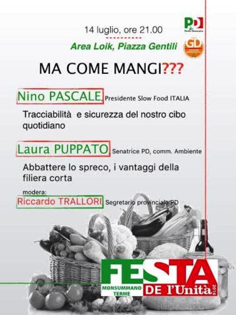 Un appuntamento da non perdere. Giovedì, 14 luglio 2016 alle ore 21, nell'area Loik in piazza Gentili, all'interno della Festa de l'Unità di Monsummano Terne si terrà un incontro con Nino Pascale, Presidente Slow Food Italia.