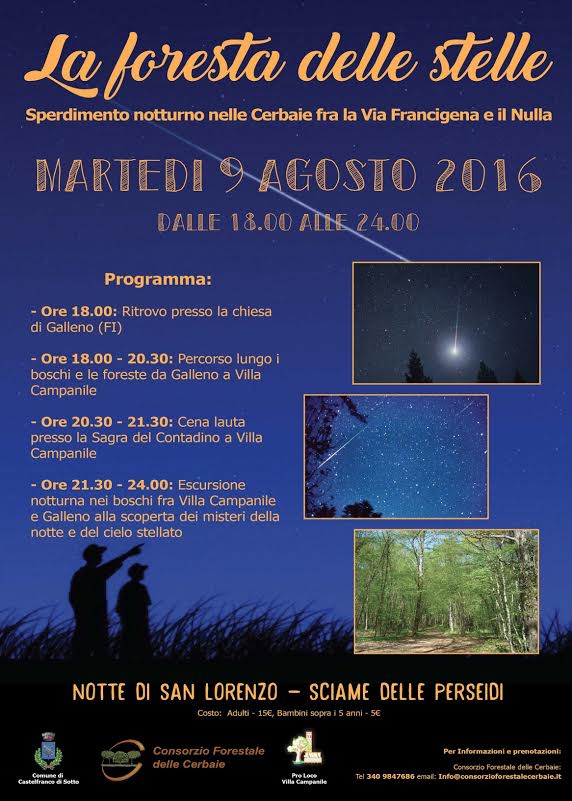 Si chiama “La Foresta delle Stelle: la Notte di San Lorenzo lungo la Via Francigena” ed è la manifestazione, giunta quest'anno alla seconda edizione, che l’Amministrazione Comunale di Castelfranco di Sotto ed il Consorzio Forestale delle Cerbaie organizzeranno il prossimo 9 agosto per la famosa notte di San Lorenzo all’interno di un più vasto piano di interventi e promozione delle Cerbaie e delle Via Francigena che l’Amministrazione Comunale ha intrapreso da tempo. L’iniziativa unirà così l’antico fascino della Via Francigena ed i profumi dei boschi delle Cerbaie che faranno da cornice allo sciame stellare delle Persiadi, in una serata dall’indubbio fascino. Il ritrovo è previsto per le ore 18.00 presso la Chiesa del Galleno dove alle 18.30 partirà il percorso in direzione Villa Campanile godendo così del tramonto sul selciato storico della Via Francigena che ancora oggi è possibile ammirare nel territorio comunale di Castelfranco. Grazie alla collaborazione ed ospitalità della Pro Loco Villa Campanile, i partecipanti ceneranno poi presso gli stand all’aperto della Sagra del Contadino che resterà aperta in via del tutto eccezionale per l’occasione. Nel dopo cena è previsto il viaggio di ritorno che si addentrerà nei boschi tra Villa Campanile e Galleno lontani da ogni fonte di luce dove sarà possibile osservare lo sciame delle Persiadi in mezzo alla natura più incontaminata.