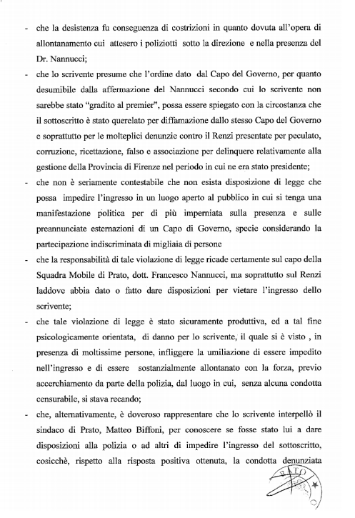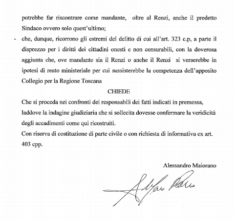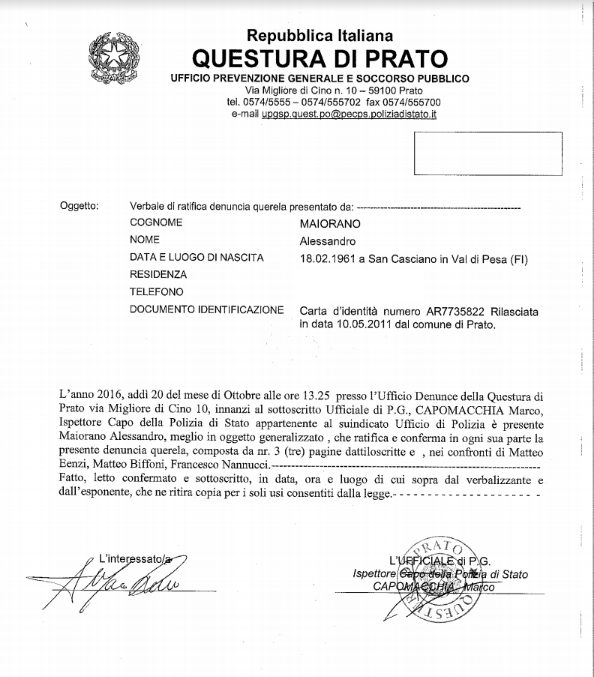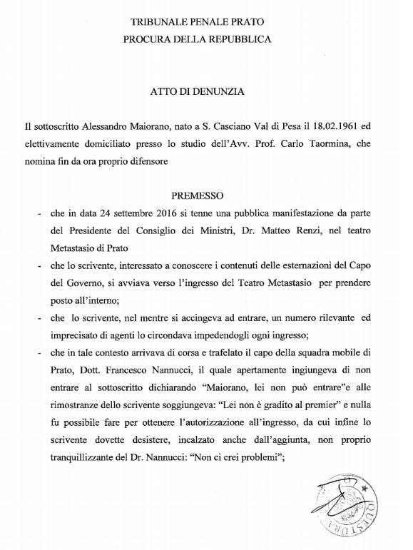 Per non essere potuto entrato nel teatro Metastasio di Prato lo scorso 24 settembre, Alessandro Maiorano ha denunciato il premier Matteo Renzi, il sindaco di Prato Matteo Biffoni e il capo della squadra mobile di Prato Francesco Nannucci. Il dipendente del Comune di Firenze, che più volte ha sporto denuncia contro il presidente del consiglio, accusa di non essere stato fatto entrare all'interno del teatro per "non creare problemi". Maiorano, si legge nella denuncia, non sarebbe "gradito al premier" nonostante "non esista disposizione di legge che possa impedire l'ingresso in un luogo aperto al pubblico in cui si tenga una manifestzione politica".