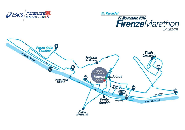 IL NUOVO PERCORSO La nuova partenza sarà in piazza del Duomo, proprio dove sorge la Cupola del Brunelleschi, resa ancora più nota e internazionale dalla serie Tv di successo prodotta dalla Rai, “I Medici”, vista in Italia da oltre 8 milioni di telespettatori di media per puntata. Da lì il plotone si porterà in direzione piazza San Marco, verso i viali di circonvallazione, e riprenderà, almeno per gran parte del tracciato sostanzialmente il percorso dello scorso anno. Variazioni significative riguarderanno soprattutto la seconda parte della gara. La mezza maratona ad esempio sarà in lungarno della Zecca Vecchia. Dopo il km 30 poi ci sarà il passaggio all’interno dell’Asics Firenze Marathon Stadium, lo stadio di atletica dedicato a Luigi Ridolfi. Nel finale, poi, consueto scenario con tutti i principali monumenti di Firenze che si disvelano uno ad uno ai podisti, compreso il passaggio sul Ponte Vecchio e, poco prima del traguardo, anche quello in Piazza della Signoria. Poi l’arrivo, con alle spalle degli atleti lo sfondo del Campanile di Giotto. Guarda anche il video sul sito www.firenzemarathon.it.