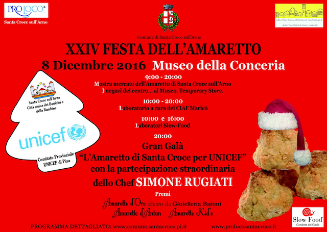 Santa Croce sull'Arno città dell'amaretto, quest'anno ancora di più: dopo aver portato il dolce santacrocese anche alla Mostra del Tartufo Bianco di San Miniato, ecco la grande Festa dell'Amaretto che si terrà al Museo del Cuoio (in via di Pelle 26) giovedì 8 dicembre 2016 per la sua XXIV edizione. Ospite d'eccezione sarà Simone Rugiati, cuoco originario di Santa Croce sull'Arno e ormai famoso in tutta Italia per i suoi show e le sue ricette. La festa è promossa dall'Amministrazione in collaborazione con l'Associazione Pro Loco, gli amarettai e il Centro Commerciale Naturale di Santa Croce sull'Arno.