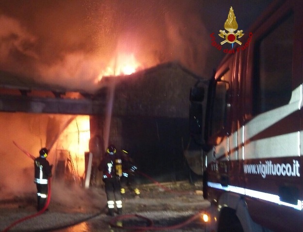 L'incendio, divampato per cause ancora in corso di accertamento, ha completamente distrutto la struttura di circa 100 m² parte in muratura adiacente ad una casa colonica e parte in struttura metallica.