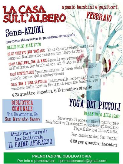 Il Primo Abbraccio presenta 'La casa sull'Albero', uno spazio per bambini e genitori. Ogni giovedi a partire dal 4 febbraio dalle ore 16,30 vi aspettiamo con due per-corsi diversi ogni mese. Il mese di febbraio sarà inaugurato lo spazio presso La Biblioteca Comunale di San Miniato basso con due proposte: dalle ore 16,30 alle 17,30 Sensazioni: percorso di gioco plurisensoriale per bambini (dai 3 agli 11 anni) e dalle ore 18 alle 19 lo Yoga dei Piccoli: giocare con lo yoga per stimolare rilassamento, concentrazione e movimento (dai 3 anni).I posti sono limitati.