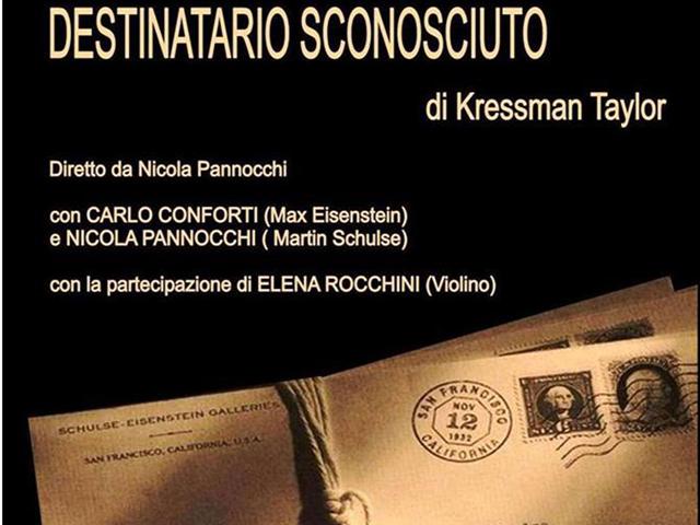 Giovedì 9 febbraio, alle ore 21 presso l'auditorium della scuola primaria “Sibilla Aleramo” di Spicchio, andrà in scena lo spettacolo dell'associazione culturale Gatteatro “Destinatario sconosciuto”, tratto dall'omonimo romanzo di Katherine Kressmann Taylor, con la regia di Nicola Pannocchi e gli attori Carlo Conforti e Nicola Pannocchi, e la partecipazione, al violino, di Elena Rocchini.