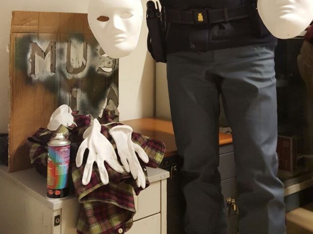 Con un ulteriore sopralluogo la Polizia ha, inoltre, rinvenuto nei pressi di Piazza dell’Abbadia, abbandonati in strada, una bomboletta spray di vernice bianca, altre due maschere bianche e uno stencil utilizzato per vergare le scritte.
