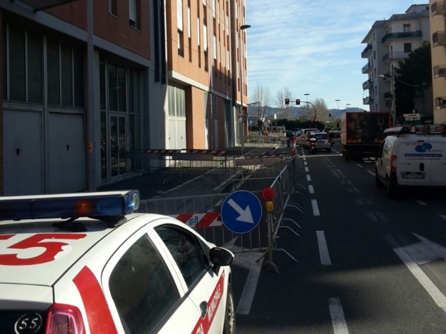 Le due squadre hanno provveduto a transennare la zona interessata (circa 35 metri), a chiudere un tratto del viale e a deviare il traffico, chiudendo la corsia sulla svolta a sinistra in Viale Boccaccio.