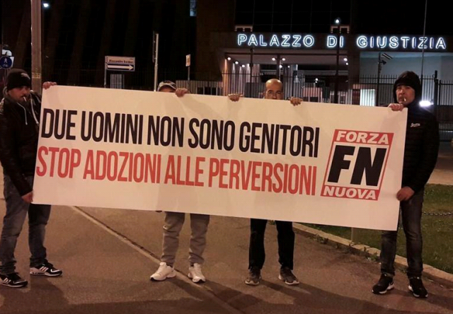 Ieri sera i militanti di Forza Nuova hanno effettuato un blitz davanti al tribunale di Firenze contro la decisione di affidare bambini a due coppie gay.