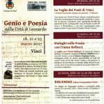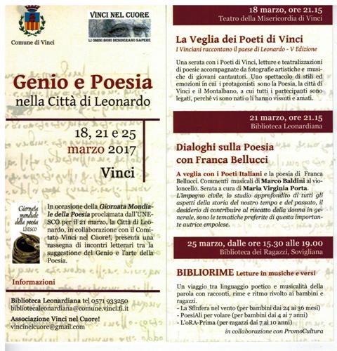 Torna a Vinci dal 18 al 25 marzo 2017 la rassegna “Genio e Poesia” per la settimana dedicata alla Giornata Mondiale della Poesia proclamata dall’Unesco nel 1999, patrocinata dall’Amministrazione Comunale, in collaborazione con l’Associazione “Vinci nel Cuore. Li omini boni desiderano sapere”. S’inizia il 18 marzo 2017, ore 21.15 presso il Teatro della Misericordia con “La veglia dei poeti di Vinci”, giunta ormai alla quinta edizione.