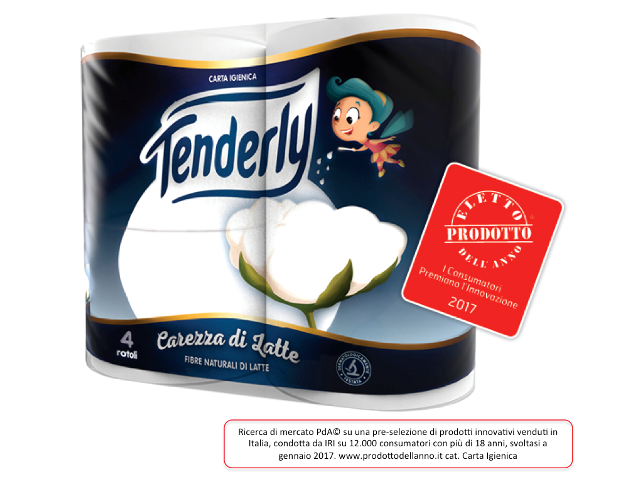 Tenderly “Carezza di Latte” si aggiudica un importante riconoscimento, eletto come “Prodotto dell’Anno” 2017 per la categoria “Carta igienica”. Il prodotto di Lucart Group è stato scelto nell’ambito della principale ricerca di mercato sul tema innovazione in Italia, condotta da IRI su oltre 12.000 consumatori con più di 18 anni a gennaio 2017, che hanno espresso le proprie preferenze sulla base dei criteri di innovazione e soddisfazione.