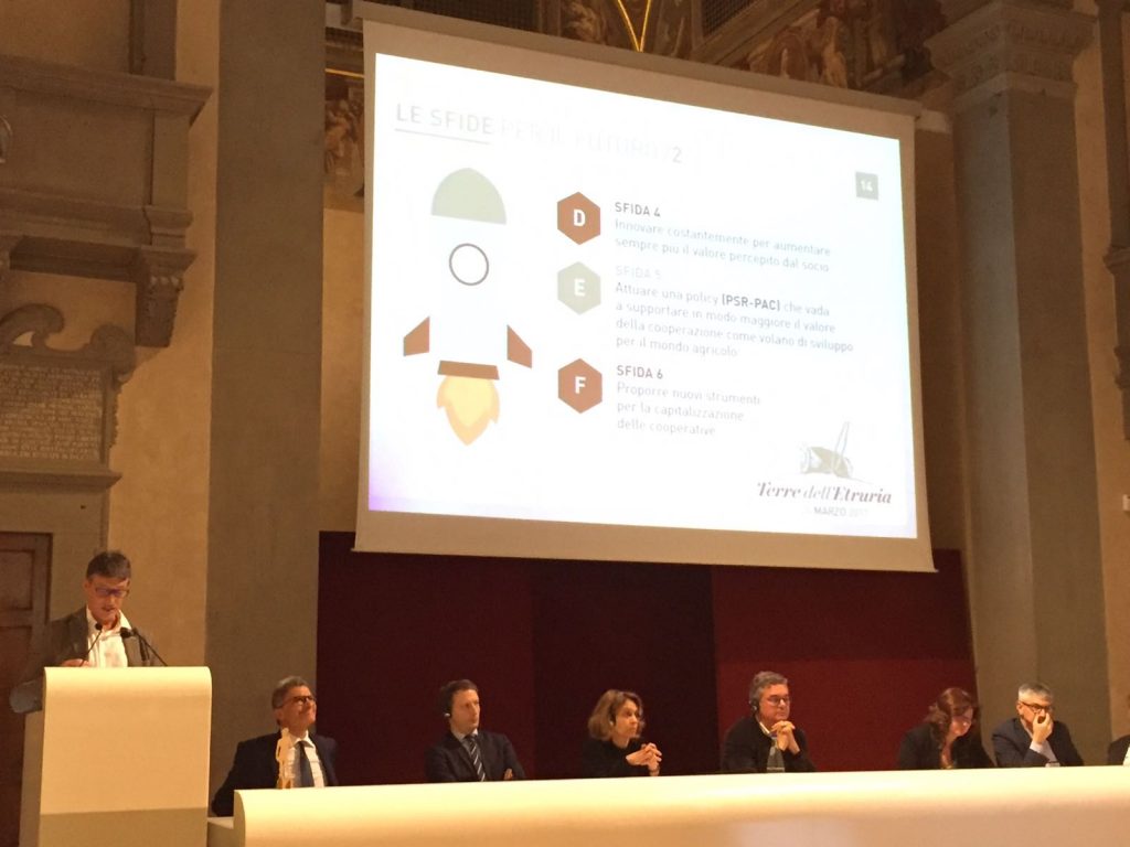 Nel suo intervento Carlotti ha presentato la cooperativa toscana, che fa 48 milioni di fatturato e conta 3.495 soci, 208 lavoratori, 414mila presenze nei punti vendita e un capitale sociale di quasi 6 milioni di euro, esplicitando la mission di Terre dell’Etruria, che è quella di “essere capaci di produrre valori e valore nel tempo, valorizzare la produzione dei soci e tutelale la continuità della cooperativa”.
