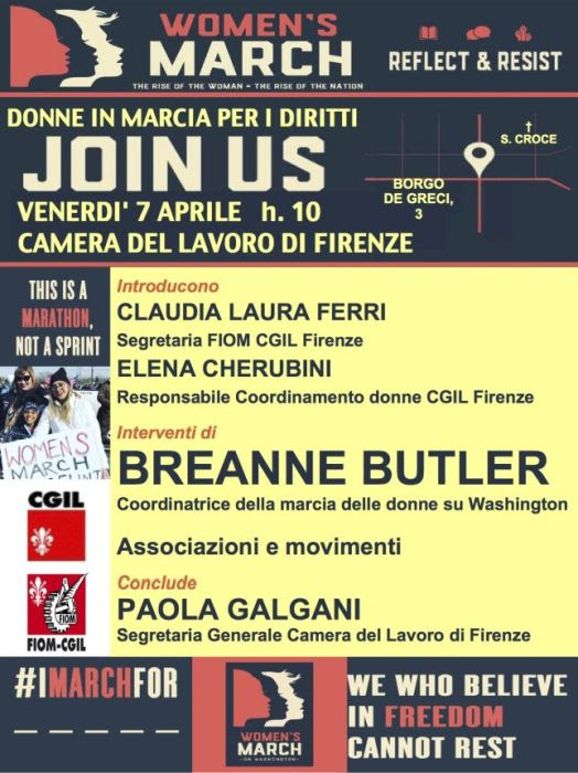 A Firenze (Camera del lavoro, Borgo Greci 3, ore 10) la mattinata sarà introdotta da Claudia Laura Ferri della segreteria della Fiom e da Elena Cherubini, Responsabile del Coordinamento donne della Cgil; poi Breanne Butler interverrà sui temi e le istanze della manifestazione quali la globalizzazione, il lavoro, l'accoglienza, le migrazioni, i populismi, i diritti e la democrazia in Europa e negli Usa, offrendo il punto di vista di chi sta coordinando un movimento comparso inaspettatamente sulla scena politica Usa. A concludere l'iniziativa sarà la Segretaria Generale della Camera del Lavoro Paola Galgani. L’iniziativa è organizzata da Cgil Firenze e Fiom Cgil Firenze. La partecipazione è aperta a tutte le associazioni, i movimenti e le persone che vorranno intervenire.