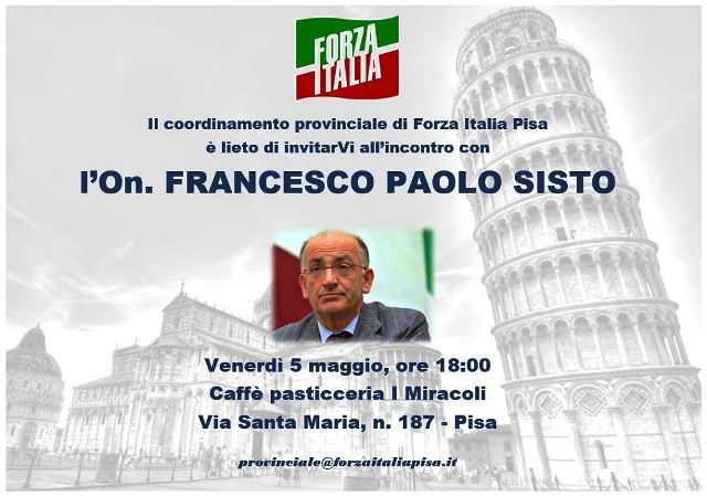 Venerdì 5 maggio, alle ore 18:00, l’On. FRANCESCO PAOLO SISTO, incontrerà iscritti, elettori e simpatizzanti di Forza Italia di Pisa e Provincia, presso il Cafè Pasticceria I Miracoli, in via Santa Maria, n. 187, a Pisa.