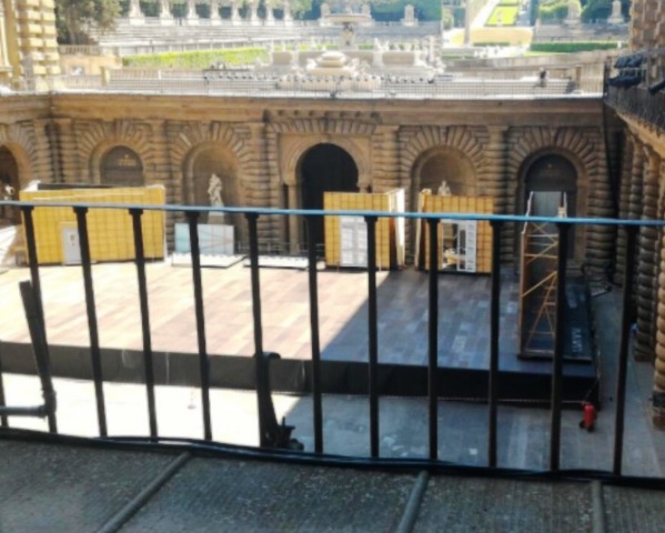 Maggio 2017 : il palco occupa il 50% del Cortile dell'Ammannati, impedendo l'accesso al Giardino di Boboli (portone sulla destra). Quell'accesso è anche via di fuga per il Palazzo e il Giardino. Insomma un bel tappo per la sicurezza e la fruizione dello spazio museale. La quinta di destra affoga pure la visuale che si può godere dai tavolini esterni della Caffetteria, se la si vuol vedere dal lato “commerciale”. Certo che il palco è cresciuto parecchio: forse il legno si è gonfiato con l'umidità.
