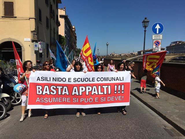 Questa mattina il personale degli Asili Nido e della Scuola dell’Infanzia del Comune di Firenze ha scioperato in modo massiccio, e oltre 400 lavoratrici e lavoratori hanno sfilato per le vie del centro cittadino, con una forte presenza anche di precari (Esecutori ed Educatori), portando in piazza la loro rabbia e la loro opposizione alle scelte dell’Amministrazione che mirano al progressivo svuotamento dei servizi a gestione diretta , sostituendoli con appalti ed esternalizzazione dei servizi.