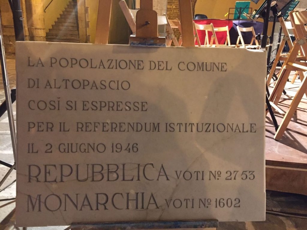 Altopascio ritrova la lapide dedicata alla Repubblica e al referendum costituzionale che si tenne il 2 giugno 1946. Per la Festa della Repubblica, che ieri sera, dopo i saluti del vicesindaco Daniel Toci, ha visto il corpo musicale “G. Zei” esibirsi in piazza Ospitalieri con brani popolari dedicati alla storia italiana, repubblicana e democratica, l'amministrazione comunale ha voluto omaggiare il paese con qualcosa in più: non una semplice celebrazione, ma la restituzione alla comunità della lapide che 71 anni fa il marmista di Altopascio realizzò per ricordare, a tutti quelli che c'erano e a tutti coloro che ci sarebbero stati un domani, come si espressero gli altopascesi e in quale forma di governo decisero di riconoscersi. 2753 voti andarono alla Repubblica, contro i 1602 per la Monarchia: un dato che nei mesi successivi alle elezioni fu inciso nel marmo, come monito, ricordo e memoria per tutti i cittadini.