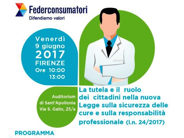 “La tutela e il ruolo dei cittadini nella nuova Legge sulla sicurezza delle cure e sulla responsabilità professionale (l.n. 24/2017)”: è il titolo e il tema del convegno (organizzato da Federconsumatori) che si svolgerà domani venerdì 9 giugno a Firenze, dalle 10 alle 13 presso l’Auditorium di Sant’Apollonia (via San Gallo, 25a).
