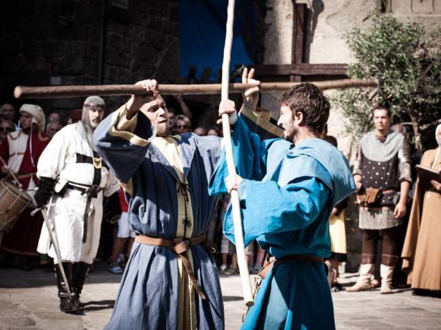 Per tre giorni e tre notti nel cuore del caratteristico borgo si anima la vita dei 'terzieri': le taverne accolgono i viandanti mentre nelle strade rivivono arti e mestieri. Sfide, danze e spettacoli raccontano i fasti di quel medioevo che rese importante questa città: per le vie si muovono musicanti, cantori e giocolieri mentre nel vicino accampamento militare si susseguono competizioni e spettacoli con il fuoco.