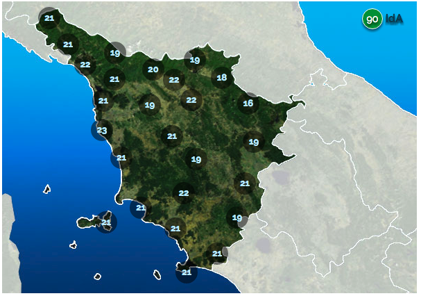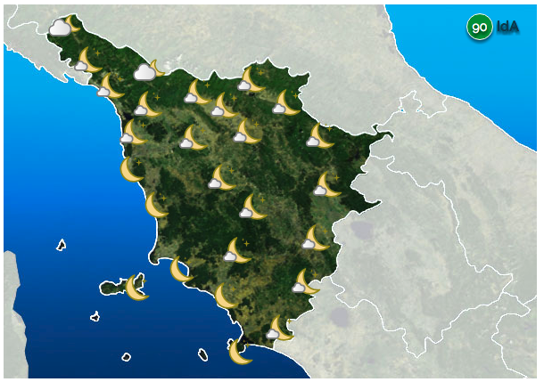 Al mattino il cielo si presenterà nuvoloso sulle province centro-settentrionali a causa del transito di nubi alte e livellate in rapido dissolvimento dalla tarda mattinata. Dal pomeriggio il cielo tenderà a schiarirsi su tutta la regione, confinando le nubi cumuliformi sulle zone appenniniche dove non si escludono brevi e localizzati piovaschi.