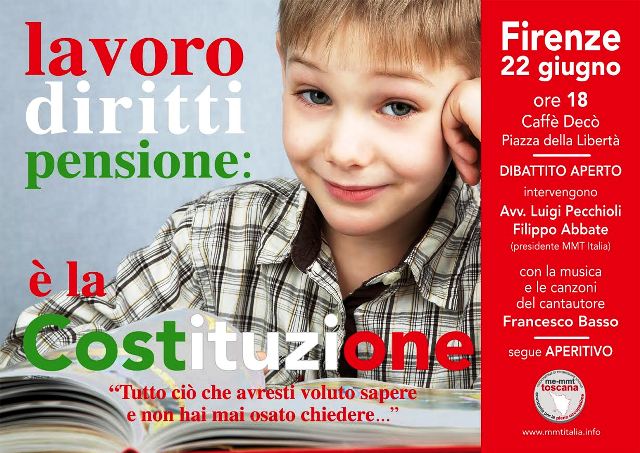 Giovedì 22 Giugno 2017 ore 18,00 presso il Caffè Decò, Piazza della Libertà, Firenze, si terrà l'iniziativa 'Lavoro, diritti, pensione: è la Costituzione. Tutto ciò che avresti voluto sapere e non hai mai osato chiedere...”