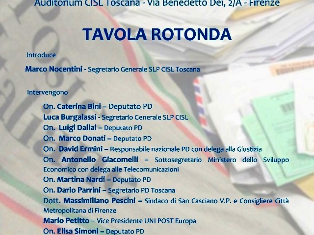 Alla presenza del sottosegretario del ministero dello Sviluppo Economico con delega alle Comunicazioni Antonello Giacomelli e di altri parlamentari e rappresentanti delle istituzioni toscane, si parlerà della possibile privatizzazione completa di Poste Italiane e degli scenari che questa comporterebbe. Il sindacato da parte sua si è sempre detto contrario a questo processo, che provocherebbe ricadute disastrose, come la significativa diminuzione dei servizi ai cittadini e una drastica diminuzione dei posti di lavoro.