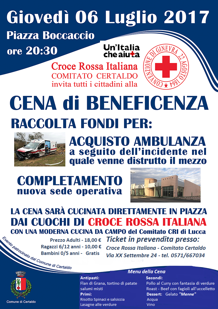 Il prossimo evento della Croce Rossa sarà una cena di beneficenza per una raccolta destinata sì ai lavori di ultimazione della nuova sede, ma anche all'acquisto di una nuova ambulanza dopo il terribile incidente di febbraio scorso che ha provocato la morte di un 77enne. La cena popolare si svolgerà in piazza Boccaccio giovedì 6 luglio con l’ausilio di una moderna cucina da campo della Croce Rossa Italiana del Comitato di Lucca.