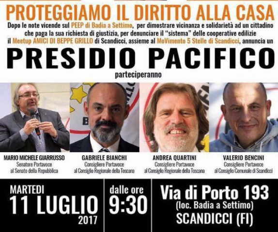 Parteciperanno al presidio il portavoce al Senato Mario Michele Giarrusso, i portavoce in Regione Toscana Gabriele Bianchi e Andrea Quartini ed il portavoce al comune di Scandicci Valerio Bencini, chiediamo il sostegno di tutti in questa manifestazione di solidarietà nei confronti di un cittadino onesto che chiede soltanto che la legge venga rispettata e che non vengano calpestati i suoi diritti.
