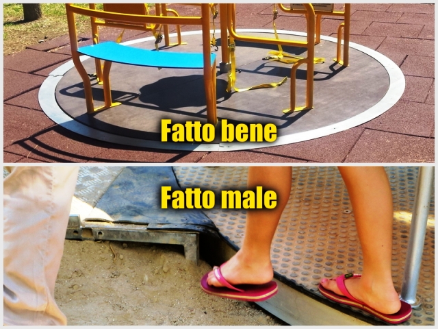Questi i fatti: a maggio viene installata una giostrina "inclusiva" al Parco #Iqbal, però si scordano di mettere la pedana per l'accesso delle carrozzine. Nei giorni seguenti viene costruita una rampa in lamiera: è un ostacolo fisso e tagliente rispetto a chi sta girando sulla giostrina. Si fanno male in diversi, il Comune interviene nuovamente e nasconde il bordo tagliente sotto un pezzo di gomma. Il pezzo di gomma (forse peggiorativo perché non elimina il pericolo, ma lo nasconde) è pure montato male, dopo pochi giorni si stacca.