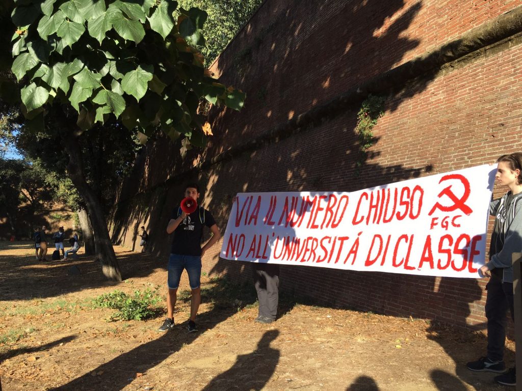Questa mattina, in occasione del test d'ingresso di medicina alla Fortezza, il Fronte della Gioventù Comunista ha organizzato un'azione di protesta, accogliendo gli studenti con lo slogan "Via il numero chiuso - No all'Università di classe".