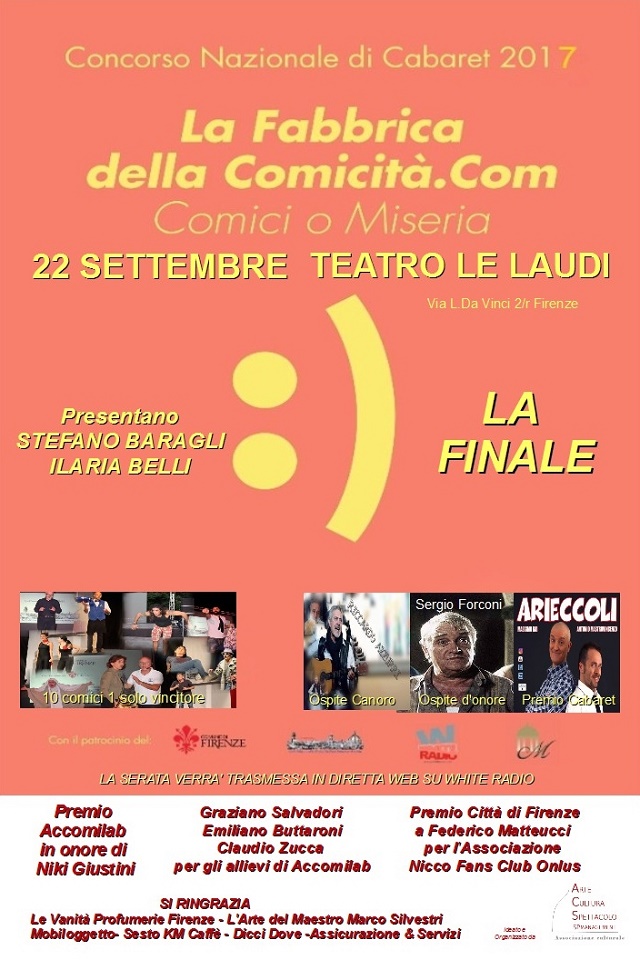 Il prossimo 22 settembre al Teatro Le Laudi di Firenze avrà luogo la finale della quarta edizione de La Fabbrica della Comicità.com Comici o Miseria che sarà presentata come sempre da Stefano Baragli ma per la prima volta insieme alla conduttrice, cantante e attrice pisana Ilaria Belli.