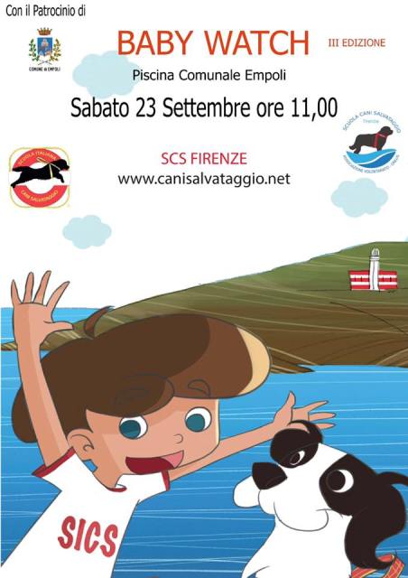 Tornano a Empoli i cani bagnino, ‘eroi a 4 zampe’ per la terza edizione di “Baby Watch”, evento in programma sabato 23 settembre, alle 11, nella piscina comunale di Empoli, in viale delle Olimpiadi. L’evento è a ingresso gratuito e i protagonisti assoluti sono loro, i cani della Sics - Scuola Italiana Cani da Salvataggio - della sezione Firenze.