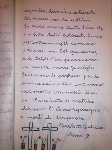 “C’era un lungo viale di sassolini, con lapidi, dove c’erano ritratti e sottoscritti i nomi delle persone morte. Dalle due parti c’erano croci e fiori finti e freschi. Andammo a visitare il cimitero dove erano state sepolte tutte le persone che morirono durante il disastro della diga”. La storia continua. E’ un passaggio di mani, che ogni anno da Tavarnelle guarda a nord e corre fino a Longarone. Il valore della comunità rafforza il ricordo di quel volto dell’Italia devastato che non può e non deve essere dimenticato. I bambini di ieri hanno accompagnato i bambini di oggi nel viaggio dell’amicizia e della memoria, sulle tracce di quella lunga storia, fatta di rispetto, conoscenza e solidarietà che lega da oltre mezzo secolo Longarone e Tavarnelle.