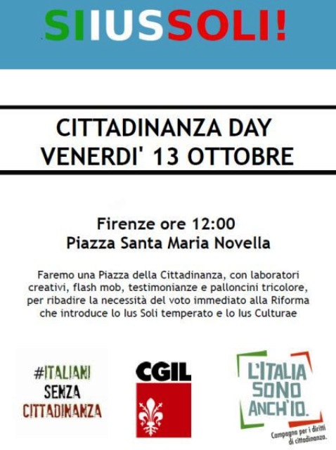 Nella giornata di mobilitazione nazionale "Cittadinanza Day" (promossa da '#ItalianiSenzaCittadinanza' e 'L’Italia sono anch’io' ), per l'approvazione della riforma sullo Ius Soli, la Cgil manifesterà anche a Firenze con la Rete degli Studenti e l’Udu (hanno aderito Arci, Anpi, partiti, associazioni). L'appuntamento è per un flash mob alle ore 12 oggi in piazza Santa Maria Novella: l'obiettivo è trasformarla in una Piazza della Cittadinanza, con laboratori creativi, striscioni, testimonianze e palloncini tricolore che voleranno, per ribadire la necessità del voto immediato alla Riforma che introduce lo Ius Soli temperato e lo Ius Culturae.