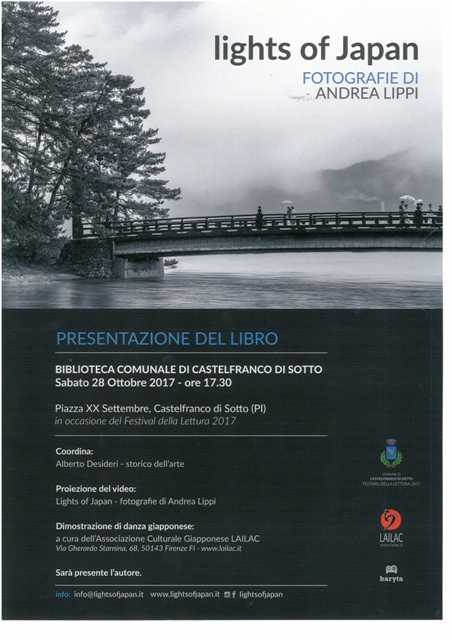 Alle ore 17,30 si torna in Biblioteca per la presentazione libro fotografico di Andrea Lippi “Lights of Japan”. Il volume sarà introdotto dall’intervento dello storico d’arte Alberto Desideri. Per l’occasione sarà possibile assistere a una dimostrazione di danze tradizionali giapponesi a cura dell’Associazione Culturale Giapponese Lailac e una proiezione fotografica di immagini tratte dal libro.