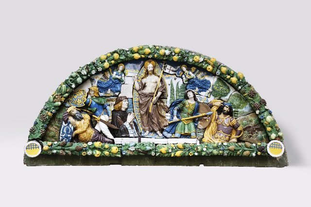 Dopo l’esposizione alle grandi mostre presso il Museum of Fine Arts di Boston e la National Gallery di Washington tra 2016 e 2017, approda a Firenze un capolavoro che ha lasciato l’Italia nel lontano 1898: la lunetta con la Resurrezione di Giovanni della Robbia. Verrà presentata al pubblico nella cornice del Museo Nazionale del Bargello, dove si conserva la maggiore raccolta al mondo di sculture realizzate in terracotta invetriata dai Della Robbia. Commissionata probabilmente intorno al 1520 da Niccolò di Tommaso Antinori (1454-1520), che dette inizio alla fortuna imprenditoriale di questo antichissimo casato fiorentino, la lunetta è di dimensioni monumentali (cm 174,6 x 364,5 x 33) e resta oggi uno dei più notevoli esempi della produzione di Giovanni della Robbia (Firenze 1469-1529). Figlio di Andrea e insieme a lui continuatore della bottega del nonno Luca, Giovanni si indirizzò verso una produzione contraddistinta da una maggiore esuberanza decorativa e cromatica, come appare proprio da questo straordinario esemplare, rimasto per quasi quattro secoli nella sua ubicazione originaria, la prestigiosa Villa Le Rose costruita fuori le mura di Firenze quale residenza di campagna e sede, già in antico, di produzione vinicola. La lunetta raffigura il Cristo risorto, con il committente Antinori in ginocchio alla sua destra e i soldati attorno al sepolcro, secondo l’iconografia tradizionale: il tutto su un articolato sfondo di paesaggio e all’interno di una fastosa cornice di frutti e fiori popolata da piccoli animali.