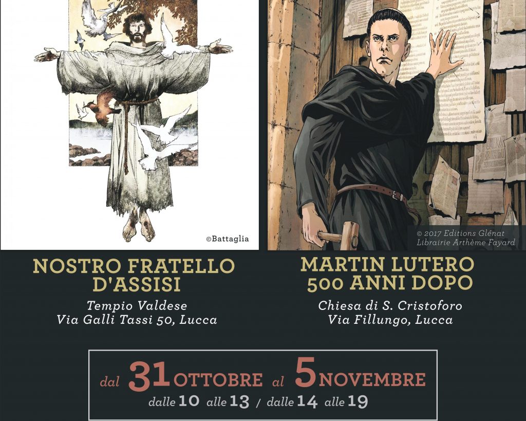 La particolarità e la novità dell'iniziativa stanno proprio nello "scambio" ecumenico realizzato dal Centro culturale "Pietro Martire Vermigli", dalla Diocesi cattolica di Lucca e dalla Chiesa valdese di Lucca. L'iniziativa si compone di due mostre: “Nostro fratello d'Assisi” (un'antologia dei disegni di grandi autori dedicati a San Francesco, a cura di Cartoon Club) sarà ospitata nel tempio valdese; l'esposizione “Lutero 500 anni dopo” (con le tavole di Filippo Cenni per l'albo “Lutero” pubblicato in Italia da Mondadori) sarà allestita nella chiesa cattolica di San Cristoforo (via Fillungo). Significativa anche la data scelta per l'inaugurazione: proprio il 31 ottobre di 500 anni fa, infatti, Martin Lutero affisse le 95 tesi sulle indulgenze, una data che viene considerata l'inizio della Riforma protestante.