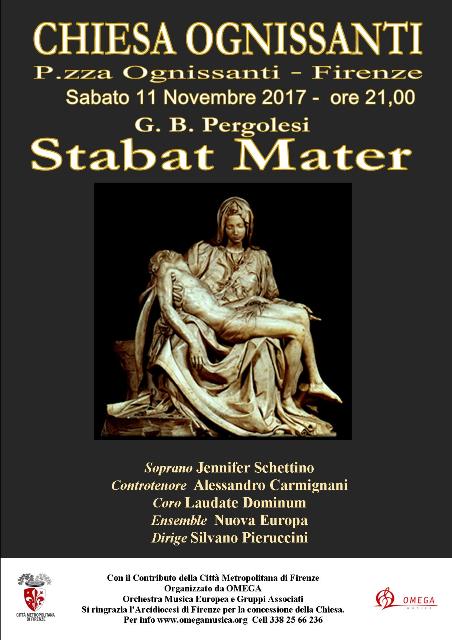 Sabato 11 alle ore 21 uno Stabat Mater di Giovan Battista Pergolesi d’eccezione, nella bellissima Chiesa Ognissanti a Firenze con la famosa coppia di canto sacro: il soprano Jennifer Schettino e il controtenore Alessandro Carmignani , il coro femminile Laudate Dominum, accompagnati dall’Ensemble Nuova Europa. Direttore Silvano Pieruccini. Ingresso libero.