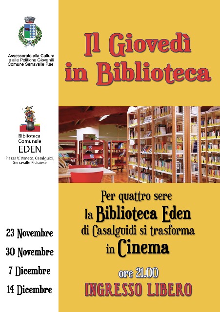 L’Assessorato alla Cultura ed alla Politiche giovanili del Comune di Serravalle Pistoiese, promuove la rassegna: “Il Giovedì in Biblioteca”. Tutti i giovedì sera, dal 23 Novembre al 14 Dicembre 2017, la Biblioteca Eden di Casalguidi si trasformerà in cinema con quattro proiezioni legate al tema fantastico. Il primo appuntamento è fissato per giovedì 23 Novembre alle ore 21.00 con l’ultima pellicola di Tim Burton che vede protagonisti, tra gli altri, Eva Green, Samuel L. Jackson ed il premio Oscar Judi Dench in un’avventura mozzafiato ambientata in una casa frequentata da ragazzi speciali. Gli appuntamenti, adatti ad un pubblico sia giovane che adulto, sono ad ingresso libero.