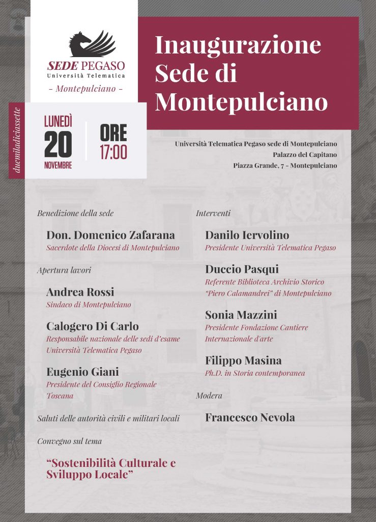 All’incontro, moderato da Francesco Nevola, interverranno: Andrea Rossi, sindaco di Montepulciano; Calogero Di Carlo, responsabile nazionale delle sedi d’esame dell’Università Telematica Pegaso; Eugenio Giani, presidente del Consiglio regionale della Toscana; Danilo Iervolino, presidente dell’Università Telematica Pegaso; Duccio Pasqui, referente della Biblioteca dell’Archivio storico “Piero Calamadrei” di Montepulciano; Sonia Mazzini, presidente della Fondazione “Cantiere Internazionale d’arte”; Filippo Masina, dottore di ricerca in Storia contemporanea.