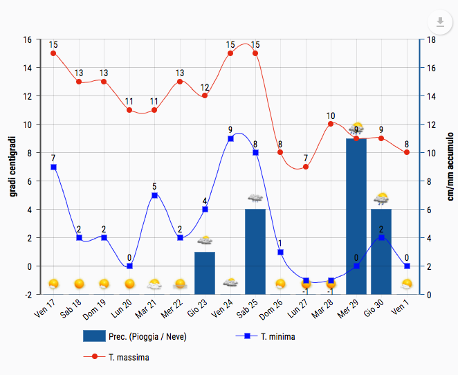Durante il giorno, la progressiva attenuazione dell'afflusso freddo in quota, aria più mite, collegata alla temporanea rimonta anticiclonica, mitigherà anche i bassi strati dell'atmosfera, registrando al suolo valori compresi tra i 12 C° ed i 15 C°. Si tratterà di termiche tipicamente autunnali, entro le medie del periodo, destinate poi a livellarsi anche nei giorni successivi, quando le temperature minime, complice una maggiore copertura del cielo, torneranno a salire gradualmente fino agli 8-9 C° del fine settimana successivo.