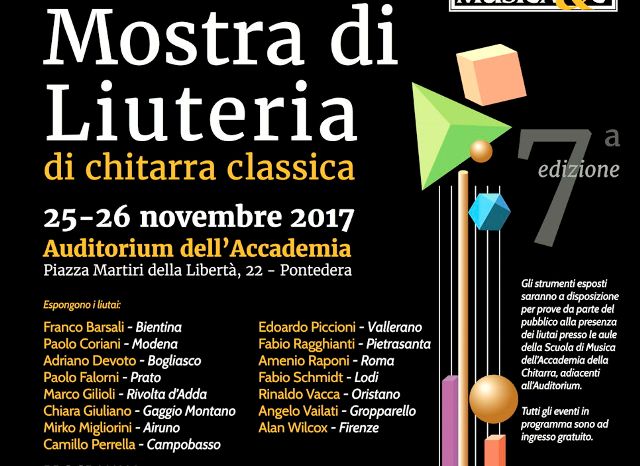 Sabato 25 e domenica 26 novembre 2017 avrà luogo la settima edizione della Mostra di Liuteria Chitarristica organizzata dall'Accademia della Chitarra. La manifestazione si svolgerà presso l'Auditorum dell’Accademia in Piazza Martiri della Libertà n. 22 a Pontedera.