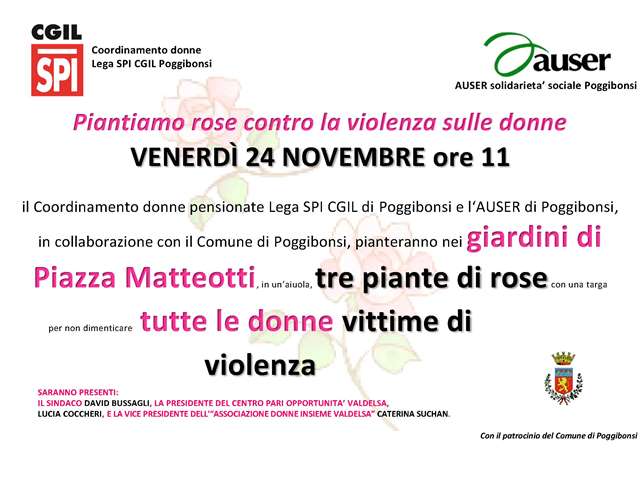 Per ricordare tutte le donne vittime di violenza Venerdì 24 novembre alle ore 11 il Coordinamento donne della Lega SPI CGIL di Poggibonsi e l’Auser locale, con il patrocinio del Comune di Poggibonsi, pianteranno nei giardini di Piazza Matteotti tre piante di rose con una targa commemorativa.