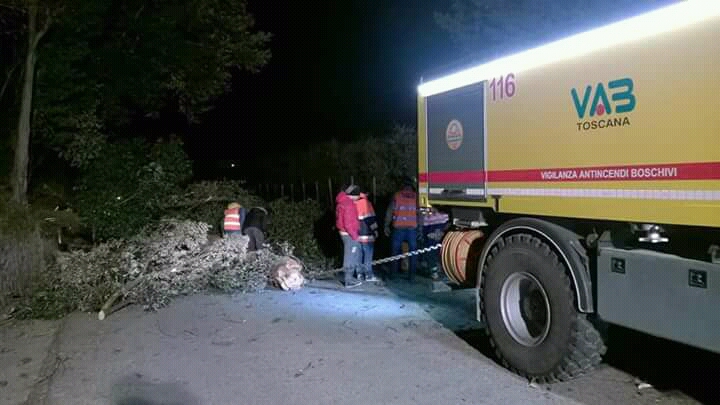 La viabilità sarà ripristinata dopo le verifiche effettuate, sugli alberi che insistono sul bordo di tale strada, dai tecnici comunali e dai vigili del fuoco. Sul posto anche la Vab.