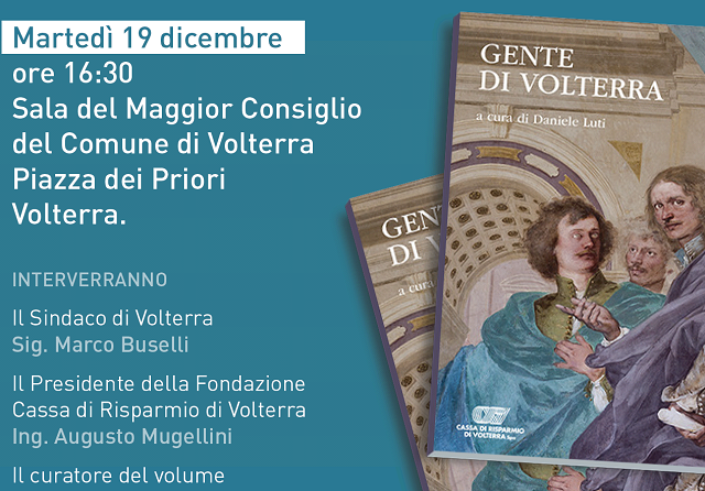 Domani martedì 19 dicembre alle 16:30 si terrà presso la Sala del Maggior Consiglio del Comune di Volterra in Palazzo dei Priori la presentazione del libro strenna "Gente di Volterra", edito dalla Pacini Editore per Cassa di Risparmio di Volterra. Il volume contiene una biografia dei personaggi storici più illustri della Città.